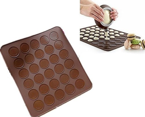Galbūt, pasitreniravus ilgiau ir paeksperimentavus su laiku ir temperatūra, pavyktų ir su juo gražiai iškepti, bet aš nusprendžiau nežaisti ir visą laiką kepu su kepimo popieriumi. Norint, kad sausainiai išeitų vienodo dydžio, galima apskritimus nusipaišyti ant kepimo popieriaus, arba atsispausdinti paruoštukus (http://4.bp.blogspot.com/-xOUxVCmBc6w/UXuL0GiIQcI/AAAAAAAAANg/_mLD56zyXgE/s1600/Macaron+Piping+Guide.jpg) ir pakišti juos po kepimo popieriumi, juk jis persišviečia.